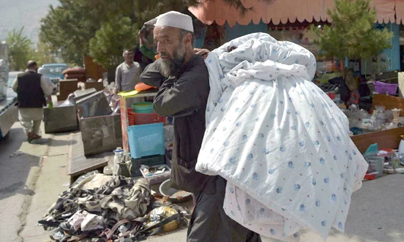 রাজধানী কাবুলের চামান-ই হোজোরি এলাকায় চারটি কার্পেট নিয়ে বিক্রির অপেক্ষায় শুকরুল্লাহ নামের এক আফগান নাগরিক। ওই এলাকায় তার মতো অনেকেই টাকার জন্য নিজেদের প্রয়োজনীয় জিনিসপত্র অন্যের কাছে বিক্রি করে দিচ্ছেন। শত শত মানুষ ফ্রিজ, কুশন, পাখা, বালিশ, কম্বল, রুপার জিনিস, পর্দা, বিছানা, ম্যাট্রেস, রান্নাঘরের জিনিসপত্র, শেলফ বিক্রি করার জন্য নিয়ে এসেছেন।