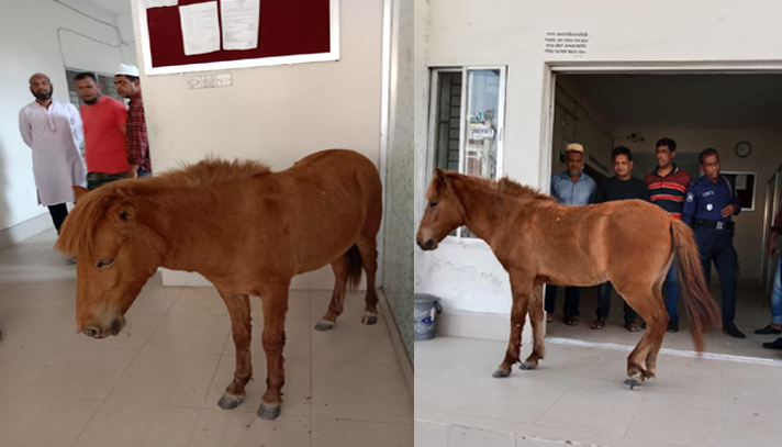 থানা সূত্রে জানা গেছে, শুক্রবার দুপুর সোয়া ১টার দিকে একটি উদ্বাস্তু ঘোড়া থানার মূল গেট দিয়ে প্রবেশ করে। সিঁড়ি বেয়ে ভবনের ভেতরে ঢোকার সময় পুলিশ সদস্যরা বাধা দেয়। এক পর্যায়ে বাধা উপেক্ষা করে ডিউটি অফিসারের কক্ষের সামনে গিয়ে দাঁড়ায় ঘোড়াটি।