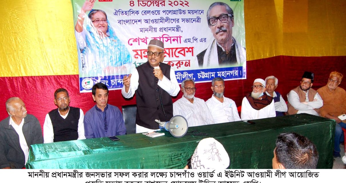 আগামী ৪ ডিসেম্বর চট্টগ্রাম পলোগ্রাউন্ড মাঠে মাননীয় প্রধানমন্ত্রী, বঙ্গবন্ধু তনয়া জননেত্রী শেখ হাসিনার চট্টগ্রামের জনসভা সফল করার লক্ষ্যে চট্টগ্রাম-৮ আসনের আওতাধীন চান্দগাঁও ওয়ার্ড এ ইউনিট আওয়ামী লীগ আয়োজিত এক প্রস্তুতি সভা ২২ নভেম্বর সন্ধ্যায় অনুষ্ঠিত হয়।