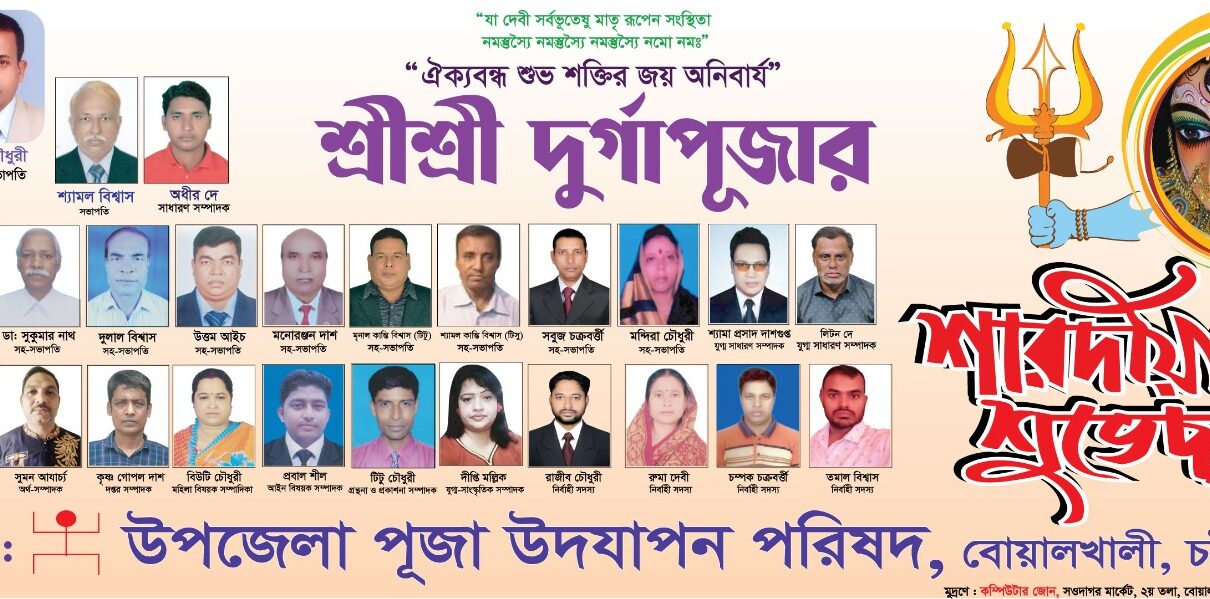 বোয়ালখালীর সকল পূজা মন্ডপে সুষ্ঠ,সুন্দর সার্থিক উৎসব মূখর পরিবেশে শারদীয় দুর্গা পুজা সম্পন্ন হওয়ায়, শ্রম , অর্থ,বস্ত্র,ভোগ্যপন্য প্রদান , নিরাপত্তা রক্ষায় সার্বিক সহযোগীতা প্রদানের জন্য সকল রাজনৈতিক নেতৃবৃন্দ, সাংবাদিকবৃন্দ, উপজেলা প্রশাসন,বাংলাদেশ সেনা বাহিনী, বোয়ালখালী থানা পুলিশ, আনসার ভিডিপি,সিভিল ডিফেন্স ও ফায়ার সার্ভিস, বোয়ালখালী পল্লী বিদ্যুৎ,স্বাস্থ্য বিভাগ,গ্রাম পুলিশ,বোয়ালখালী পৌরসভা, সকল ইউনিয়ন পরিষদসহ বোয়ালখালীবাসীকে কৃতজ্ঞতা জানিয়েছেন বাংলাদেশ […]