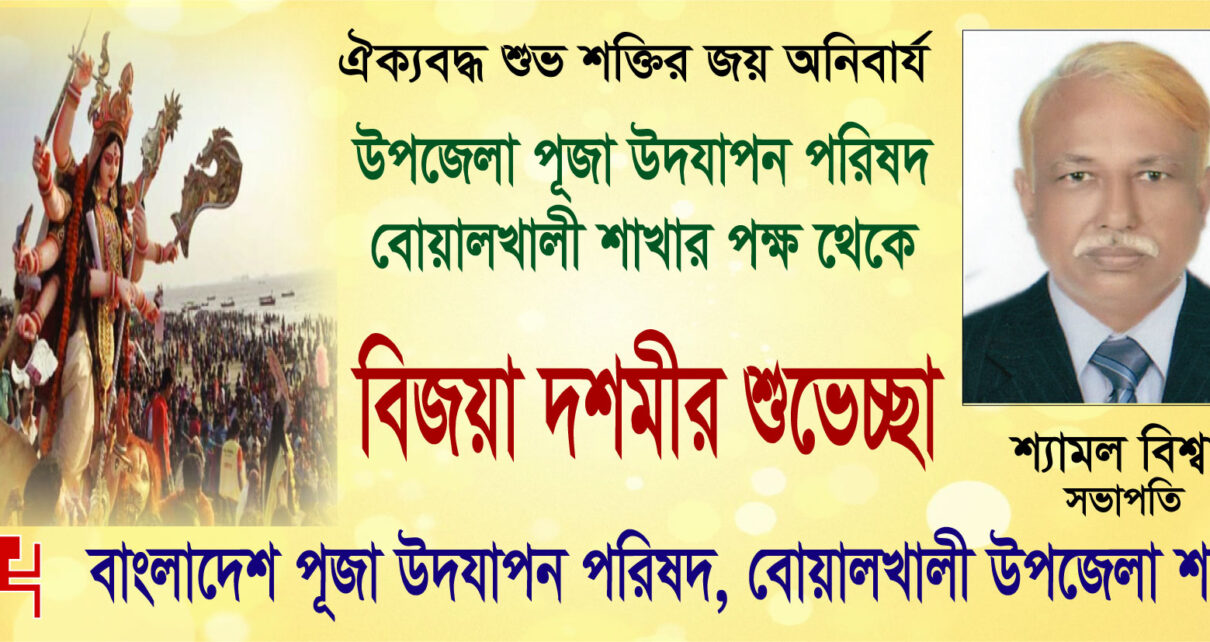 বোয়ালখালীবাসীকে বিজয়া দশমীর শুভেচ্ছা জানিয়েছেন বাংলাদেশ পূজা উদযাপন পরিষদ চট্টগ্রাম দক্ষিণ জেলার সহ সভাপতি, বোয়ালখালী উপজেলার সভাপতি শ্যামল বিশ্বাস।